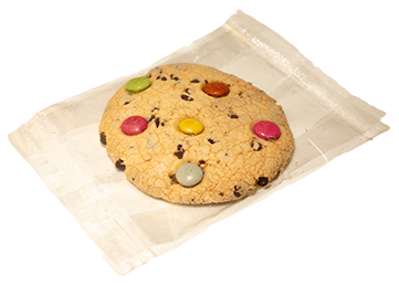 A café sized chocolate chip filled cookie topped with smarties individually wrapped for easier handling and longer shelf life