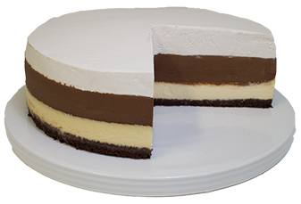 Our famous Mortal Sin cake with a chocolate bicuit layer, a baked NY cheesecake layer, a hand folded coverture dark chocolate mousse and finished with a caramel cream